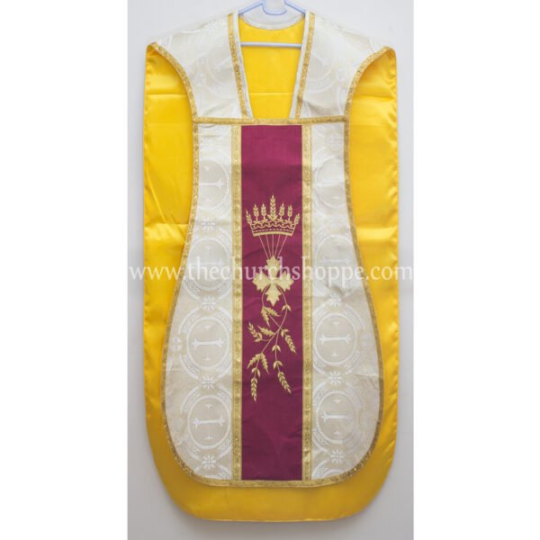 $119.99 – $129.99Price range: $119.99 through $129.99METALLIC GOLD ROMAN FIDDLEBACK CHASUBLE AND MASS SET WITH EUCHARIST EMBROIDERY