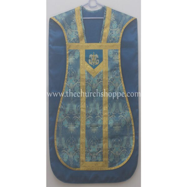 METALLIC MARIAN BLUE ROMAN FIDDLEBACK CHASUBLE AND MASS SET WITH AM EMBROIDERY